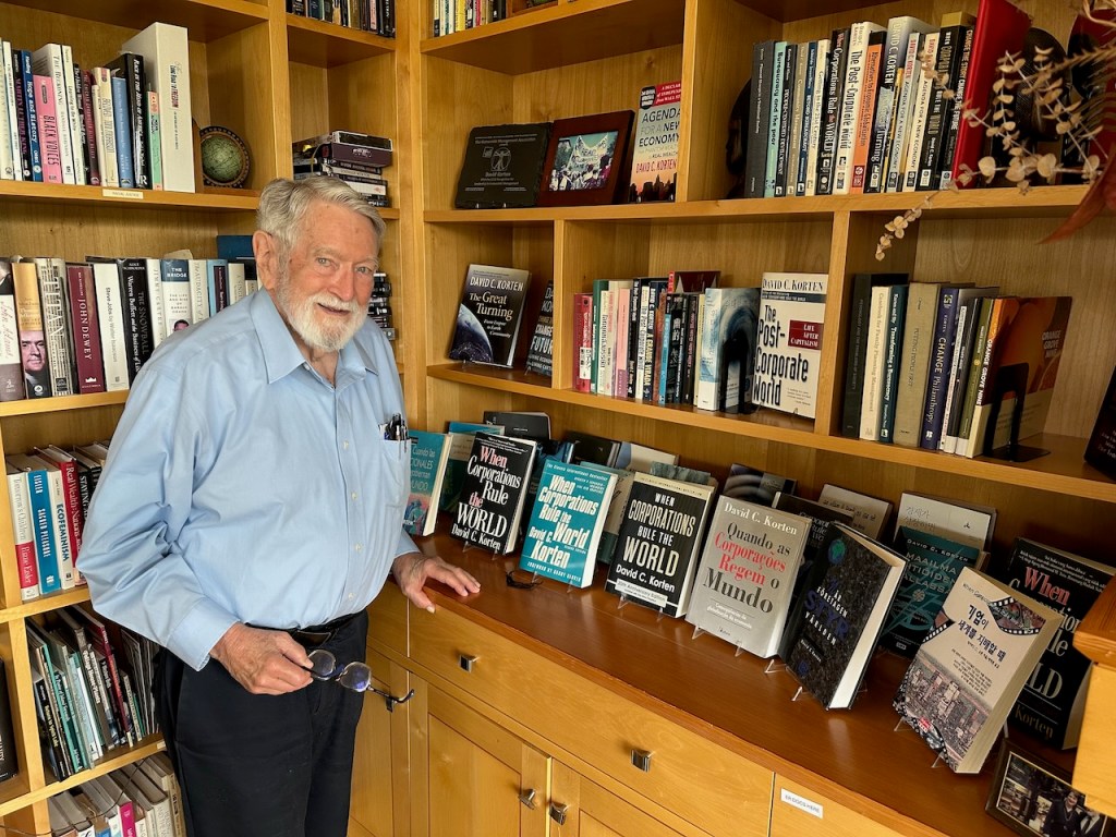 Korten later served on the Harvard Business School faculty and with the Harvard Institute for International Development (HIID). During this period, he became increasingly troubled by the transition to a profit-first economic orthodoxy, both in the corporate world and at Harvard. David said a defining moment came when an HIID colleague argued at a faculty seminar that South Korea’s agriculture added nothing to its economy because it “only fed the Korean people.” The absurdity of dismissing farmers who fed their own people as economically irrelevant shocked him into seeing the profound flaws of an economic system that valued profits of transnational corporations over human and ecological wellbeing.